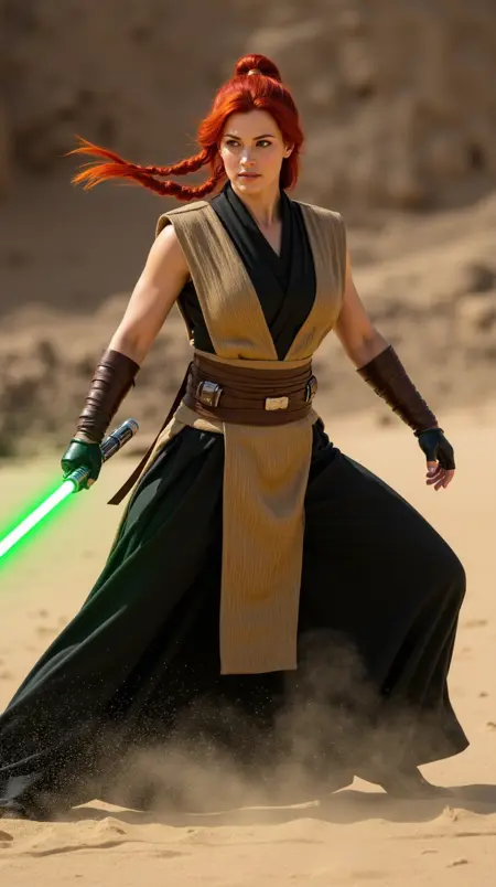 此 LoRA 主要基于服装、面料与飘动的布料进行训练,数据集中少量包含光剑,因此光剑渲染可能需要调整提示词或使用内补绘制以保持一致性。