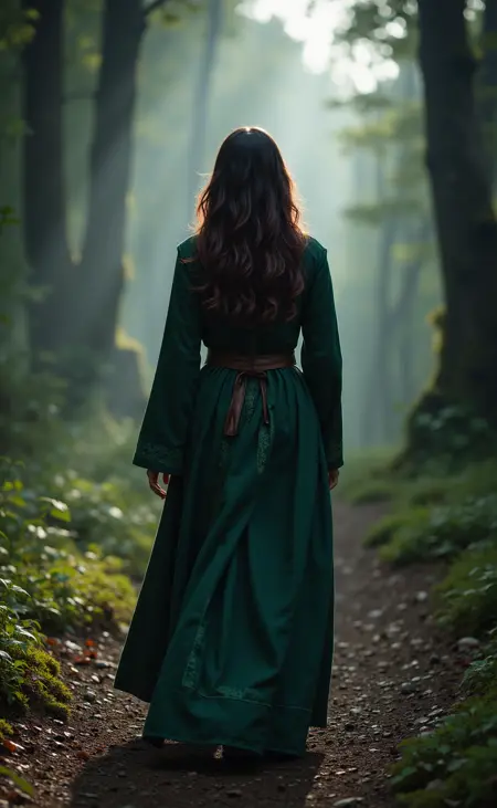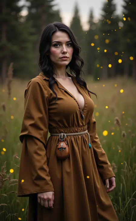 사진처럼 사실적인 마법사 스타일 복장을 입은 자연스럽게 아름다운 여성