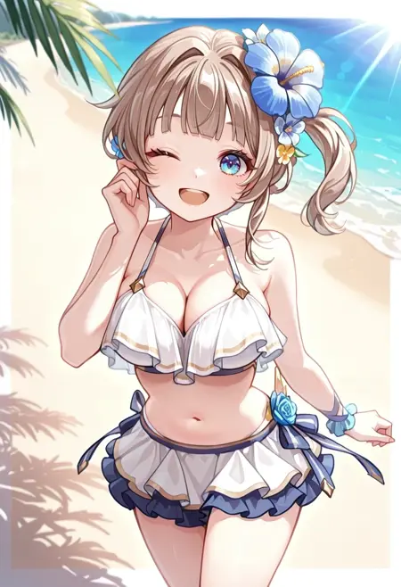 collarbone,shoulder armor,gold armor,single bare shoulder,cleavage cutout,mini crown,hair flower,hair bow,blue bow,beads,white dress,frilled dress,overskirt,