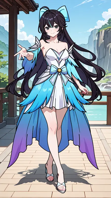dashijie, 1girl, bow, solo, black hair, black eyes, dress, hair bow, chibi, open mouth, ahoge, smile, looking at viewer, bangs, full body, outdoors, very long hair, grass, multicolored hair, collarbone, blue bow, standing, boots, medium breasts, bare shoulders, detached sleeves