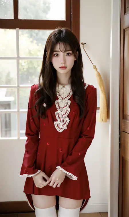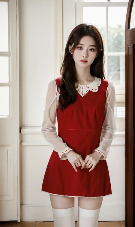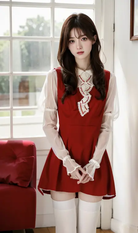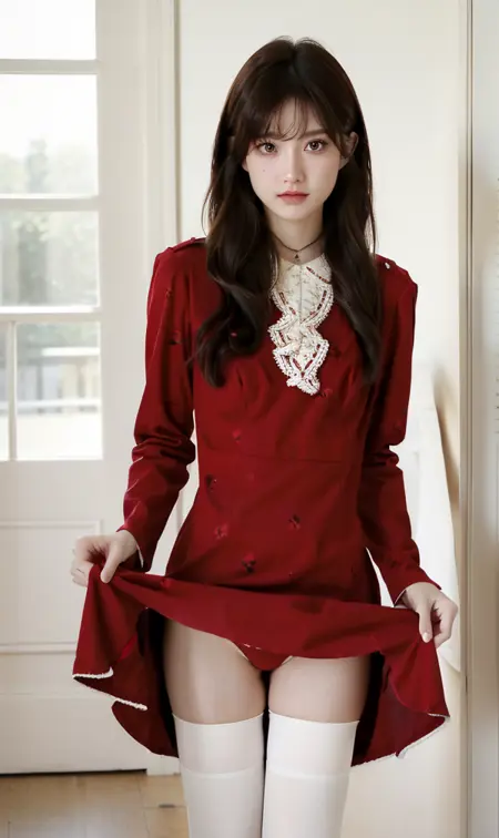 Prompt word:red-dress, dress, red dress, panties, thighhighs, white thighhighs, dress lift, lifted by self