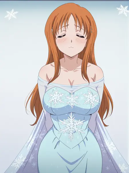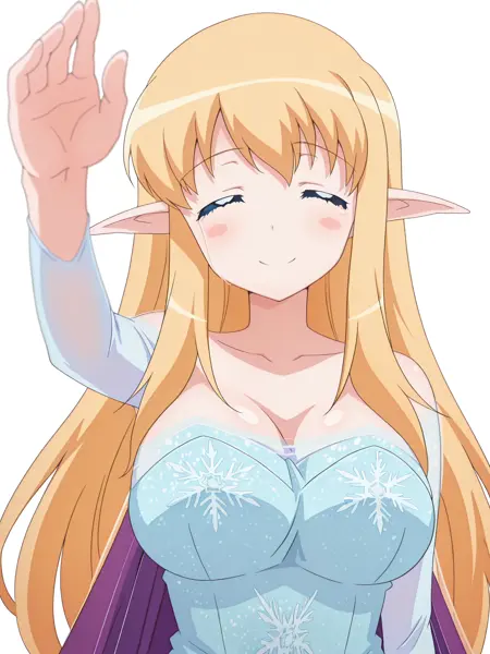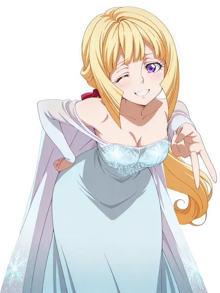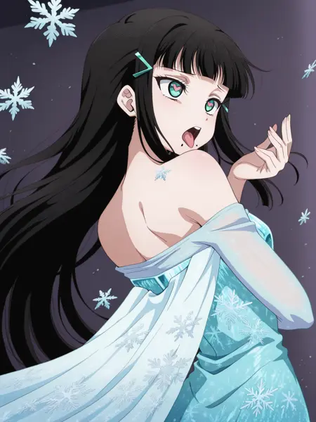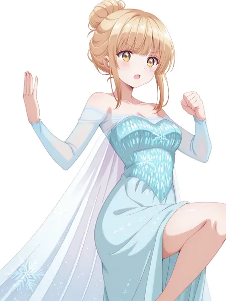 lora:elsa-frozen-cosplay-illustriousxl-lora-nochekaiser:1, elsa frozen cosplay, elsa (frozen) (cosplay), solo, dress, bare shoulders, off shoulder, blue dress, snowflakes, snowflake print, strapless, strapless dress, cape