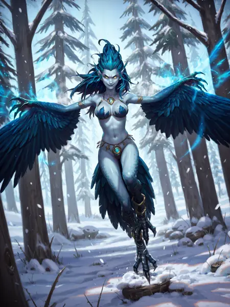 (Sometimes magic randomly appears, usually around the harpy's claws. 'magic' is for that problem, 'wowrender' I did not need to use but it might help since this tag was used for a few in-game models in the training data.)