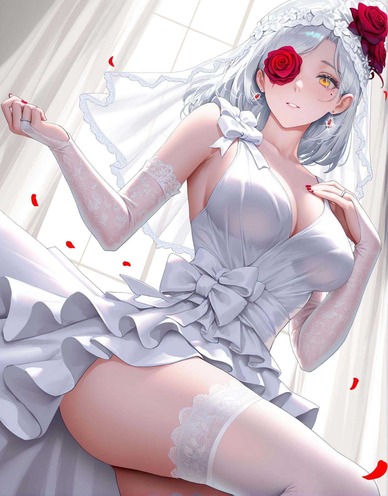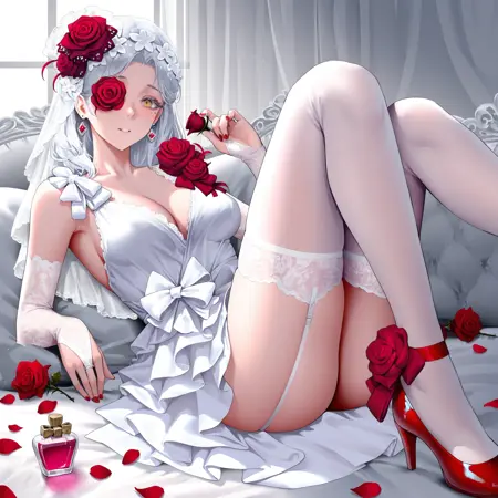 Tags: perfumercb,red rose,white dress,bridal veil,earrings,hair flower,flower over eye,yellow eyes,hair ornament,white hair,thighhighs,bridal gauntlets,white thighhighs,lace-trimmed legwear,makeup,red nails,short hair,white bow,mole under eye,high heels,red footwear,ring,perfume bottle,frills,swept bangs