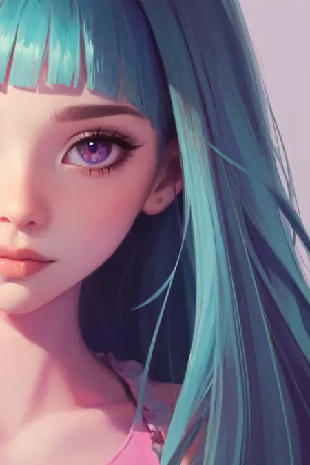 キャラクタープロンプト: メメメ、白く透き通った肌、長い髪、水色の髪、ボブカットの前髪、ピンクの目、