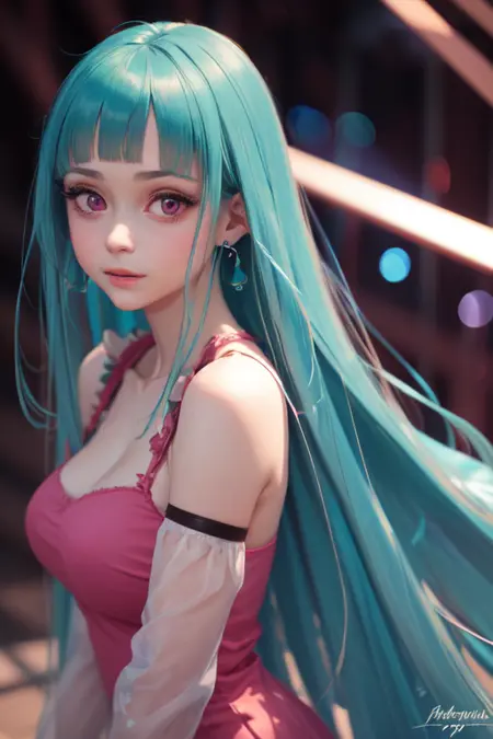 캐릭터 프롬프트: 메메메, 창백한 피부, 긴 머리카락, 하늘색 머리카락, 정면이 뾰족한 앞발, 분홍색 눈,