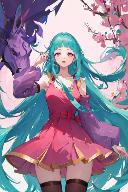 의상 프롬프트: 분홍색 드레스, 보라색 소매, 보라색 무릎 위 양말,