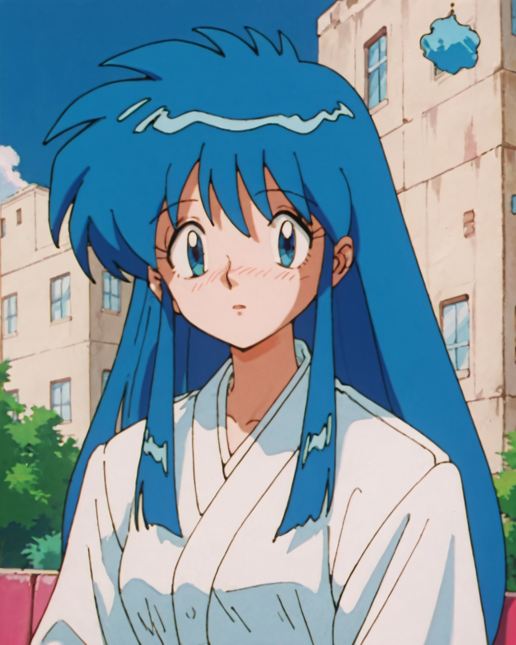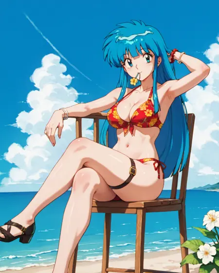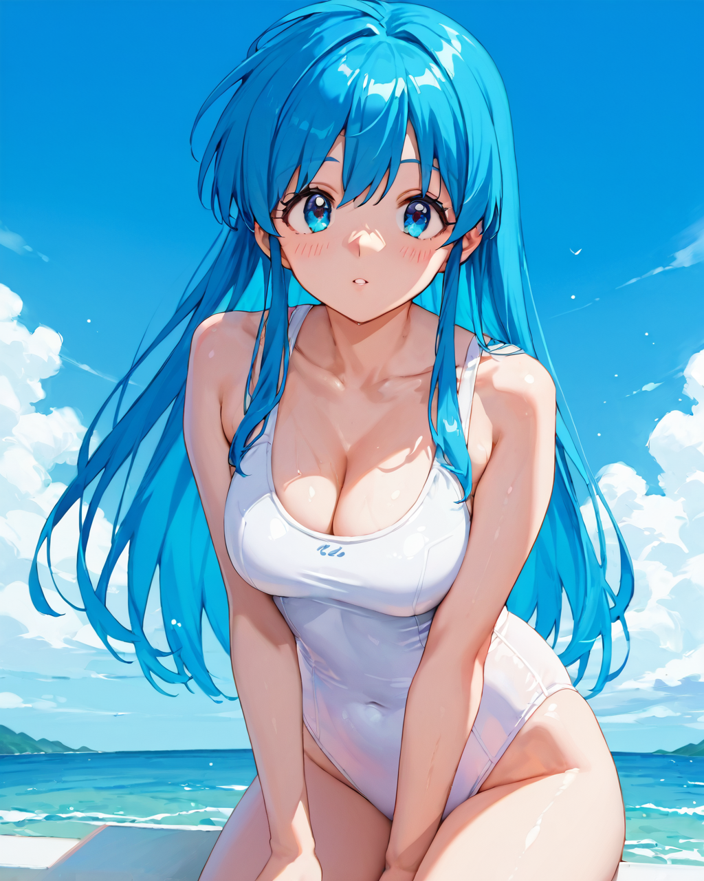 • 冰室絹,絹,1girl,长发,蓝发,浅蓝色眼睛,紧身衣,白色泳衣,连体泳衣,乳沟