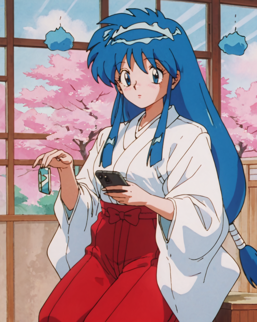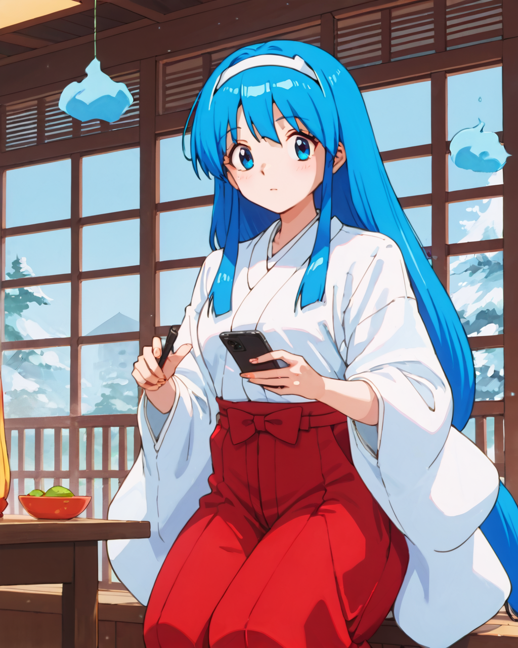 • 冰室絹,絹,1girl,和服,单人,长发,蓝发,固定电话,神社巫女,浅蓝色眼睛,电话,袴,发带,和服,短裙,宽袖,红色袴,坐着,手持,袴裙