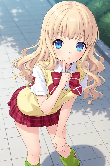 school uniform, yellow sweater vest, short sleeves, red bowtie, cross, buttons, white shirt, collared shirt, emblem, red skirt, miniskirt, plaid skirt,