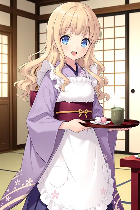 japanese clothes, wa maid, purple kimono, long sleeves, wide sleeves, obi, red sash, white apron, maid apron, frilled apron, floral print, hakama skirt, blue hakama, tabi, sandals,