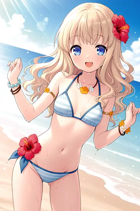 swimsuit, striped bikini, string bikini, blue bikini, white bikini, lowleg bikini, hair flower, hibiscus, red flower, necklace, flower necklace, waist flower, armlet, beads bracelet, collarbone, bare shoulders, navel,