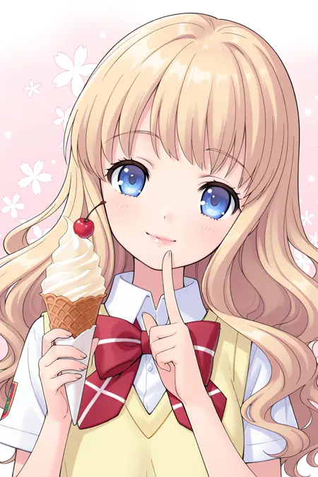 koiwai flora, blue eyes, blonde hair, long hair, wavy hair, sidelocks,