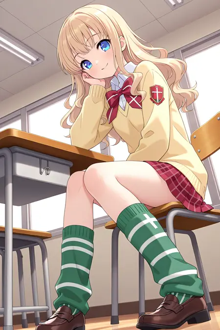 school uniform, yellow sweater, red bowtie, cross, buttons, white shirt, collared shirt, long sleeves, emblem, sleeves line, red skirt, miniskirt, plaid skirt, legs, kneehighs, loose socks, striped socks, green socks, loafers, brown footwear,