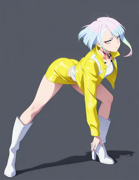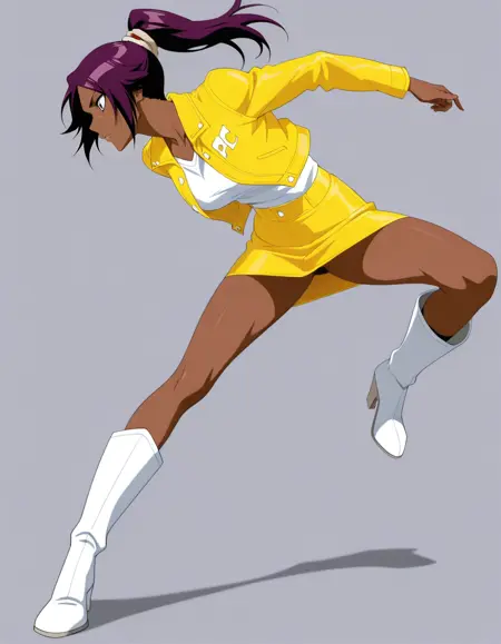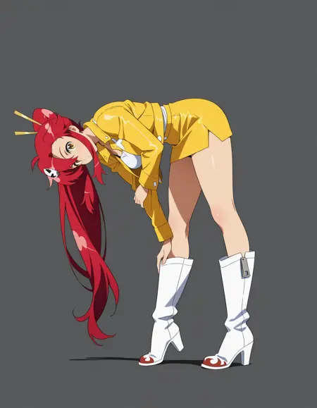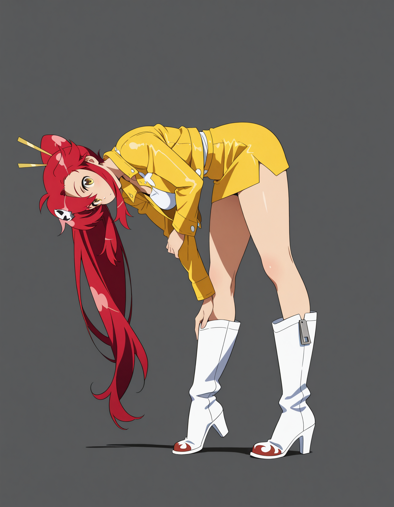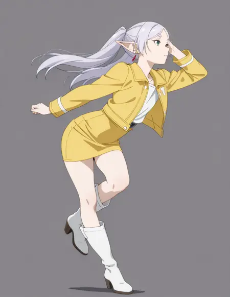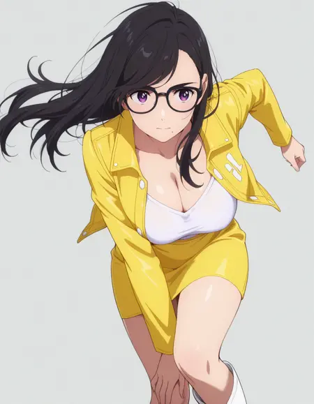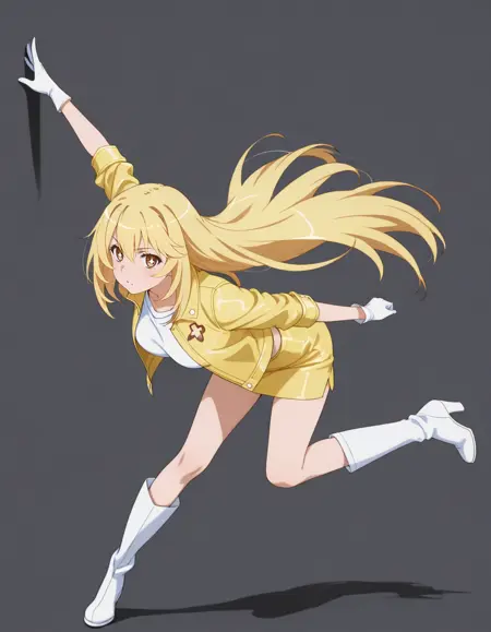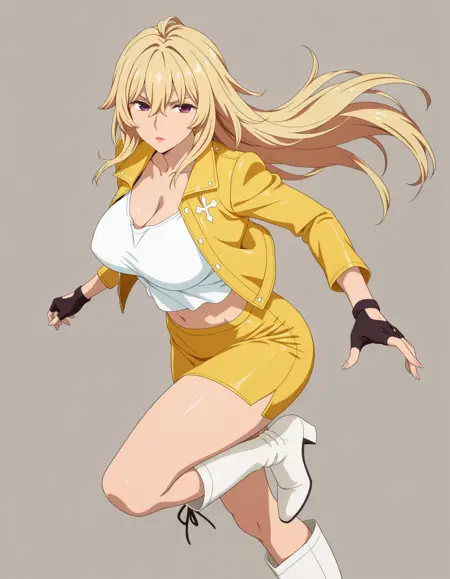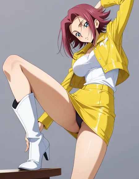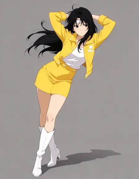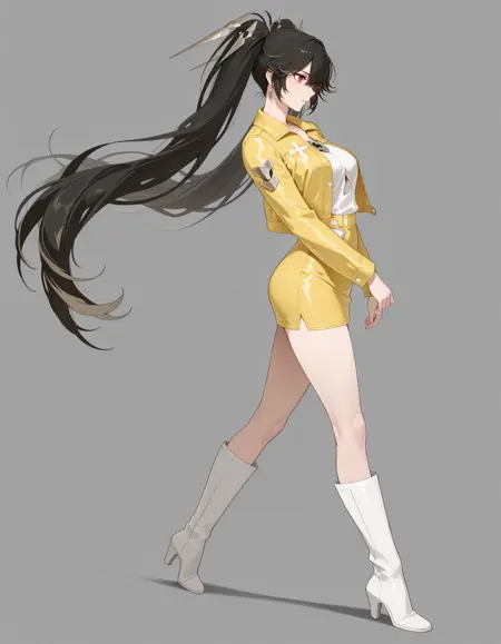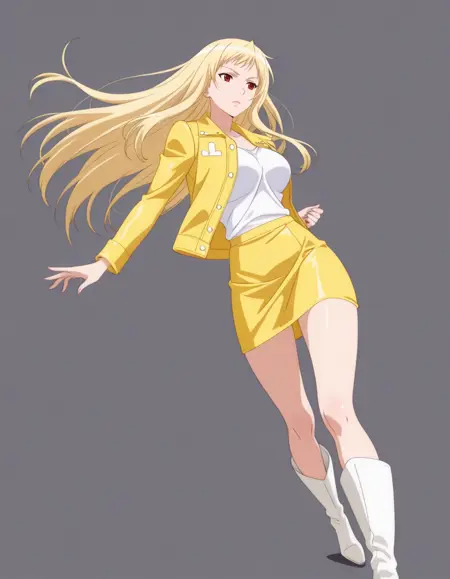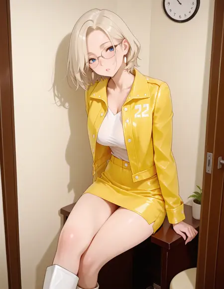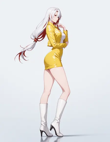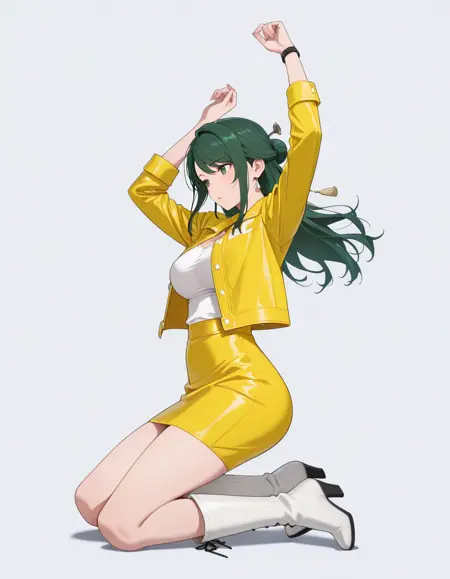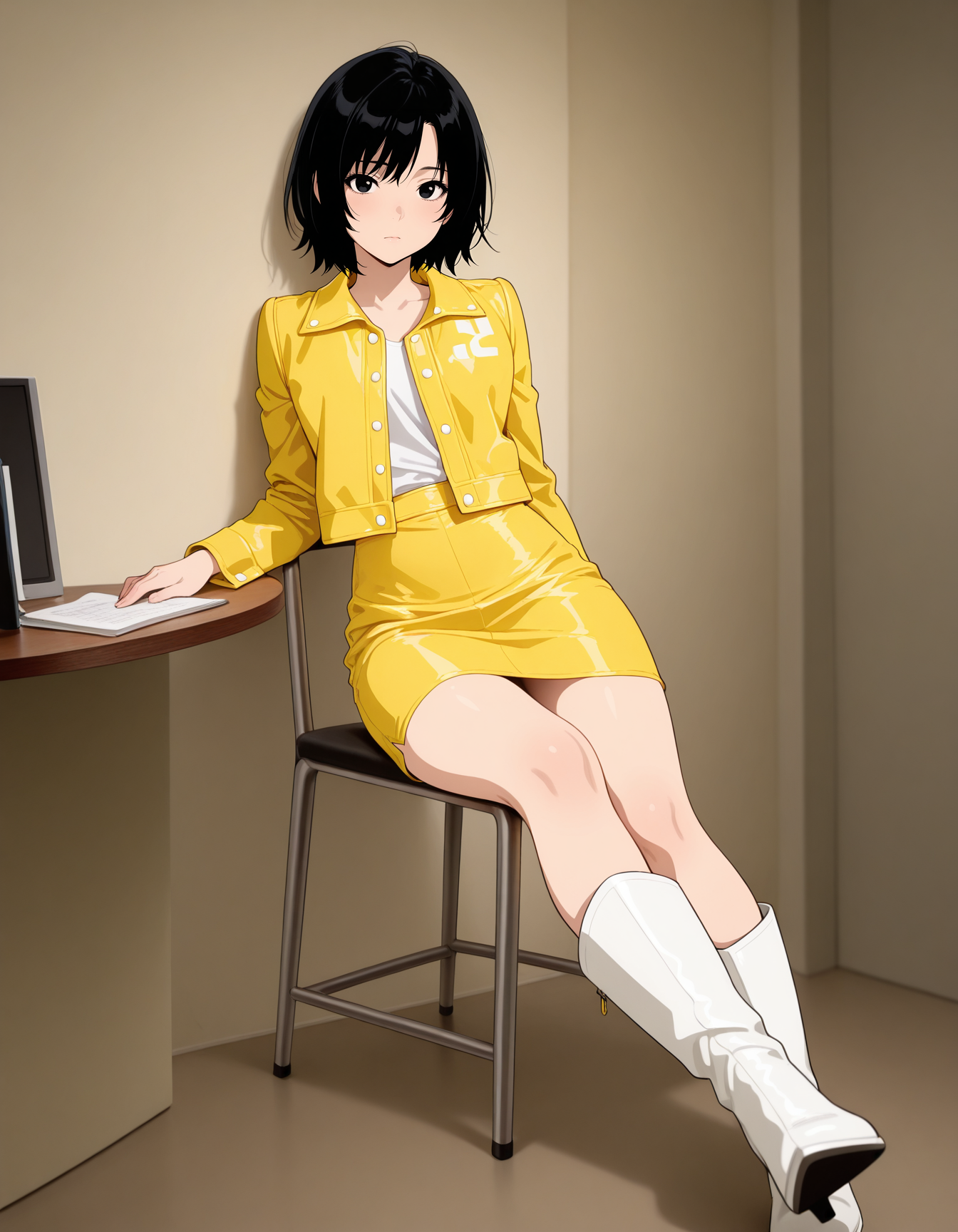 mai_yellow_jacket,white_shirt,yellow_skirt,pencil_skirt,knee_boots,high_heel_boots,white_footwear