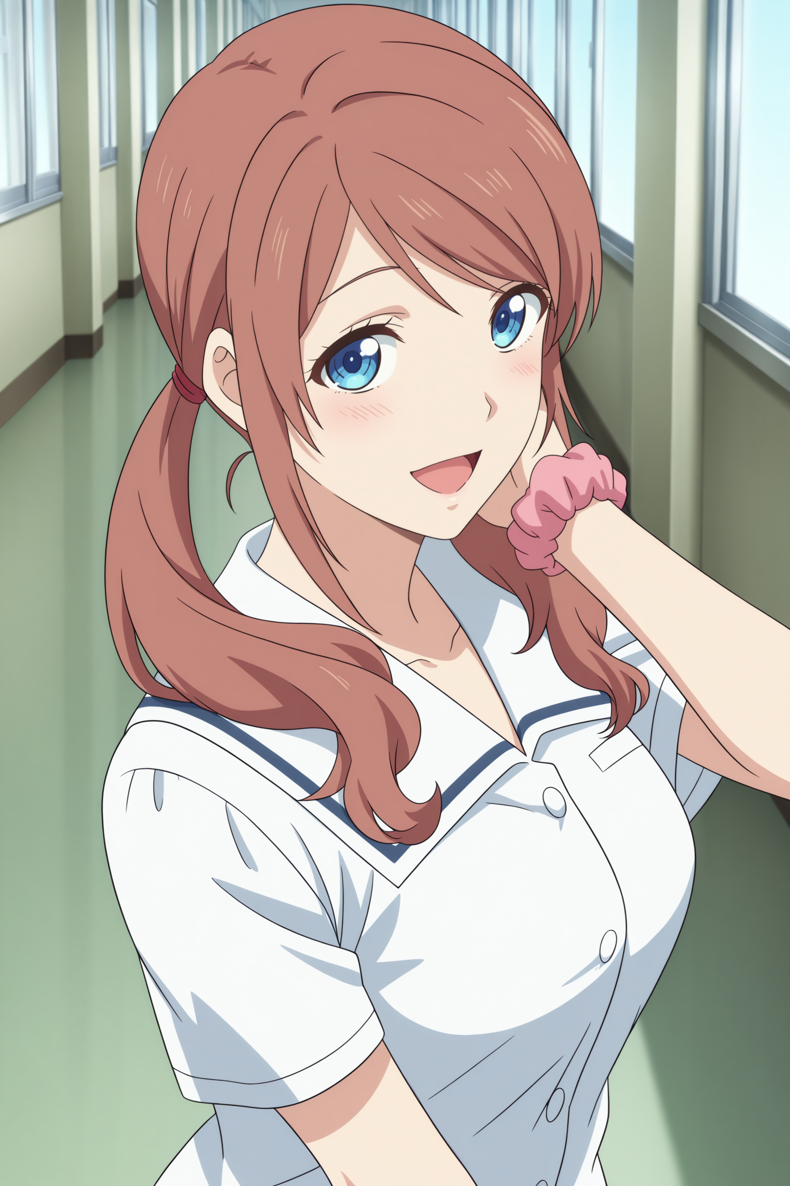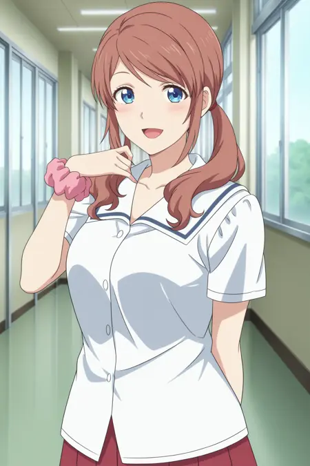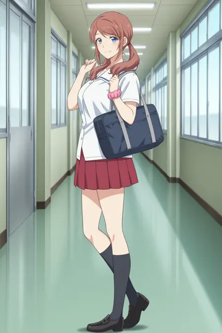 kashiwabara momo, long hair, brown hair, twintails, hair tie, sidelocks, parted bangs, blue eyes, wrist scrunchie, short sleeves, white shirt, white sailor collar, untucked shirt, red skirt, pleated skirt, black socks, kneehighs, black footwear, loafers