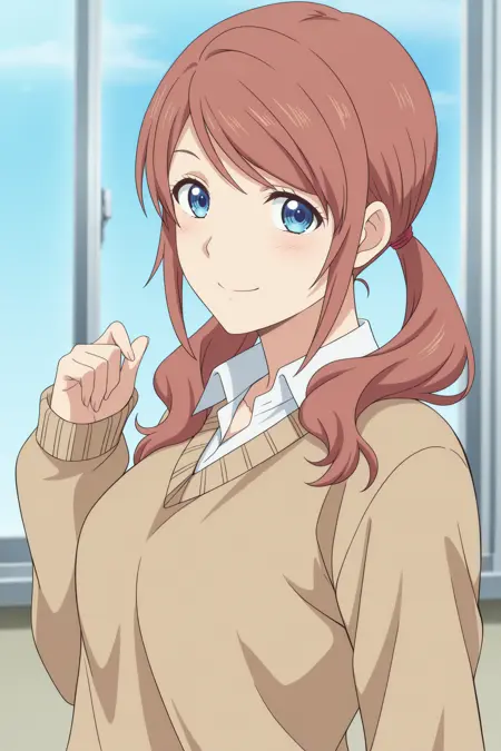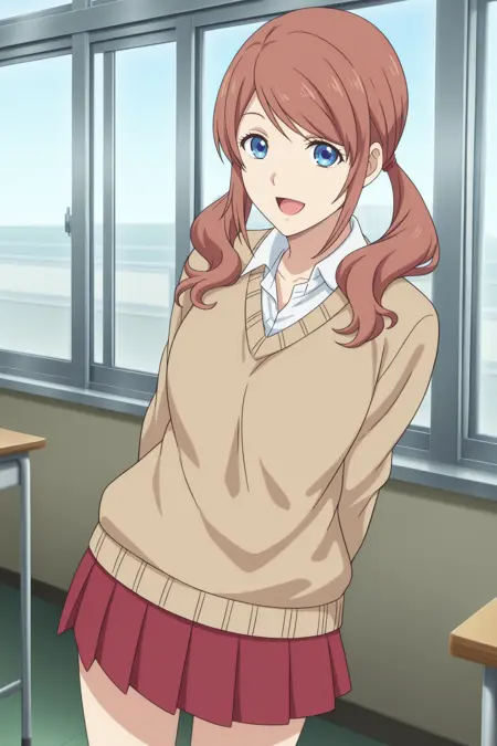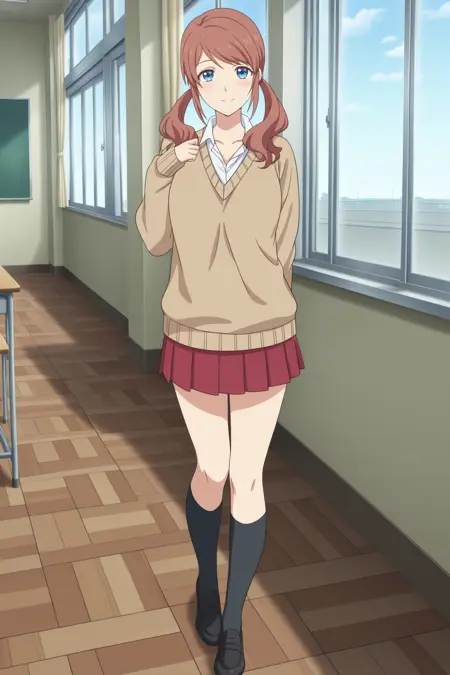 kashiwabara momo, long hair, brown hair, twintails, hair tie, sidelocks, parted bangs, blue eyes, long sleeves, brown sweater, white shirt, collared shirt, red skirt, pleated skirt, black socks, kneehighs, black footwear, loafers