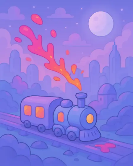 M00nb3rry,圆润玩具火车驶向柔彩天际线,发光塔楼,上方漂浮着各种形状,空中有浆果色果汁痕迹