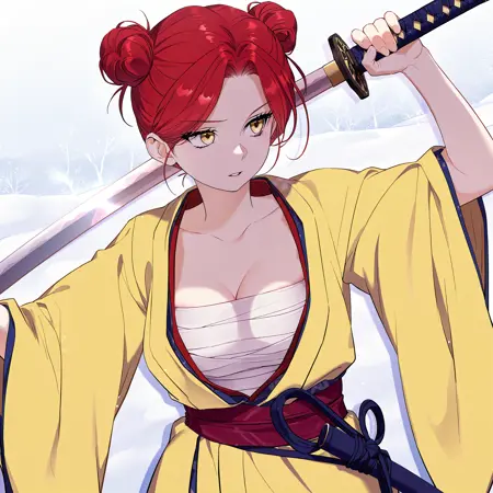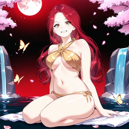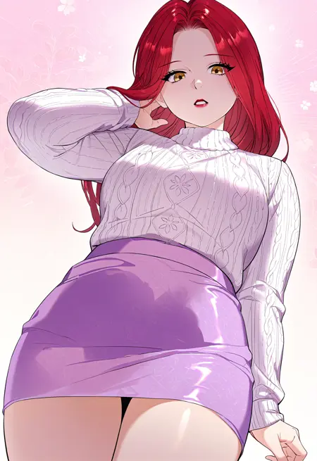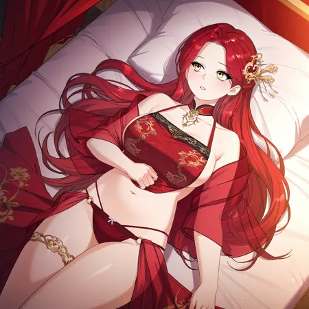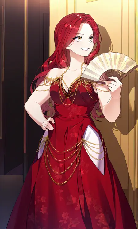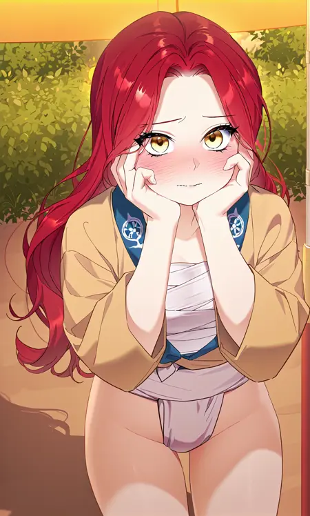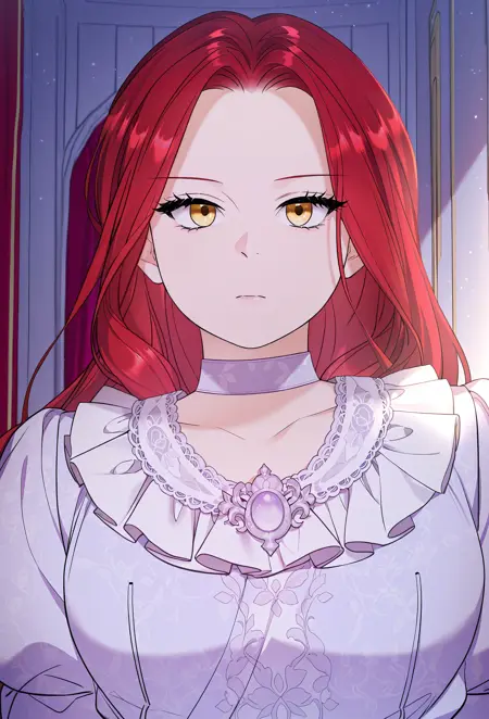 メインプロンプト: louvetria、赤髪、金色の目、長い髪