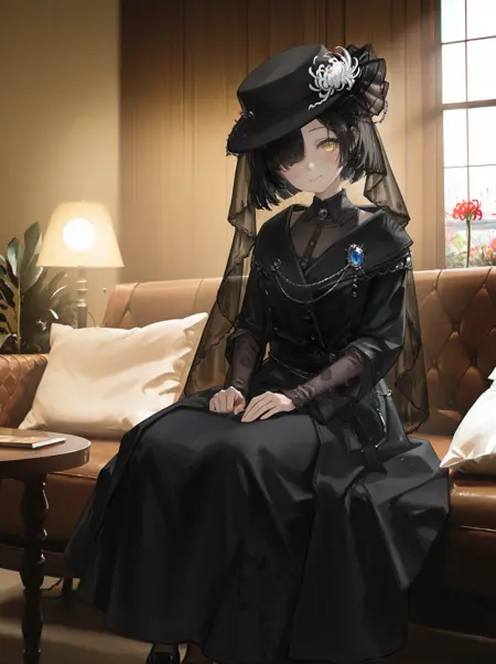 tags:necrologist2,1girl,solo,black hair,short hair,hair over one eye,parted bangs,yellow eyes,black hat,black headwear,hat ornament,black long veil,white spider lily,see-through capelet,black ascot,black coat,jewelry,gem,chain,long sleeves,translucent armwear,black dress,long dress,black loafers,