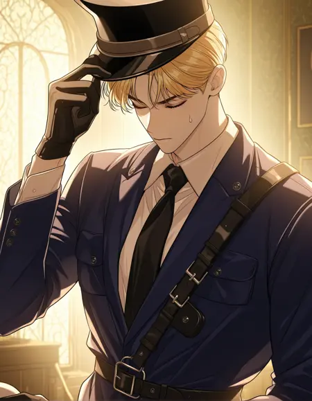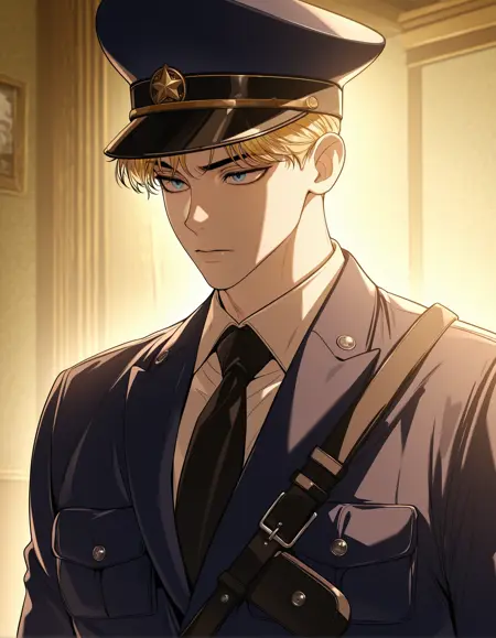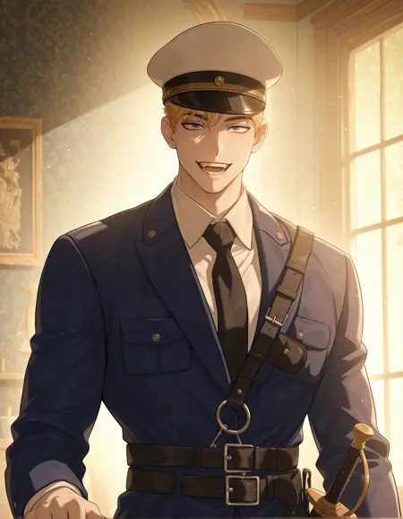 衣装 - エデン・ダンカン・ランカスター、1人の男の子、男性に焦点、帽子、シングル、青い目、ネクタイ、黒いネクタイ、武器、制服、警察、警察制服、軍服、白いシャツ、シャツ、ベルト、笑顔、剣、短い髪、観察者を見つめる、青いジャケット、ジャケット