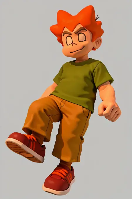 PicoFNFC, 1boy, light skin, short spiky ginger hair, distinctive white eyes, no pupils, green shirt, beige pants, maroon sneakers with orange laces, light beige soles, short, chibi, no sclera, 3d render, pico (newgrounds),