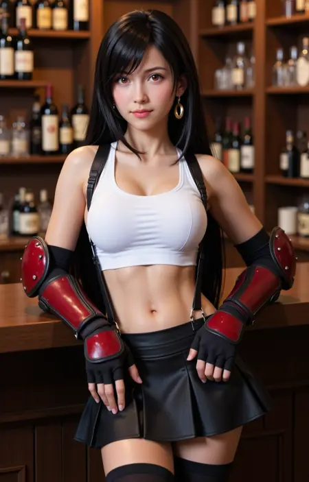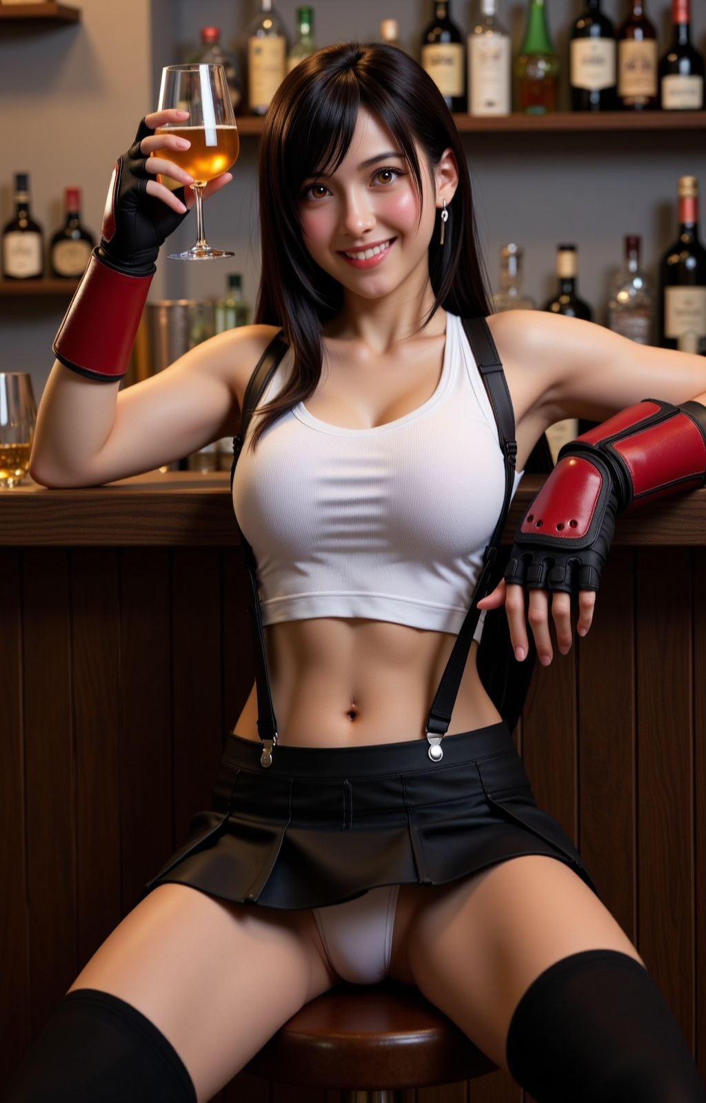 realistic, tifa, ass, bar \(place\), long hair, solo, skirt, low-tied long hair, breasts, crop top, earrings, thighhighs, suspenders, jewelry, black thighhighs, alcohol, gloves, black skirt, large breasts, tank top, counter, suspender skirt, bottle, black hair, white tank top, cup, elbow gloves, no panties, bare shoulders, indoors, fingerless gloves, miniskirt, lips, looking back, blurry, thighs