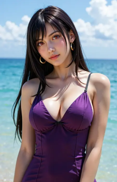 realistic, tifa, breasts, solo, earrings, jewelry, long hair, red eyes, black hair, cleavage, purple dress, dress, looking at viewer, crescent earrings, large breasts, upper body, outdoors, lips, ocean, official alternate costume, crescent, sky, bare shoulders, blurry background, blurry, nose, beach