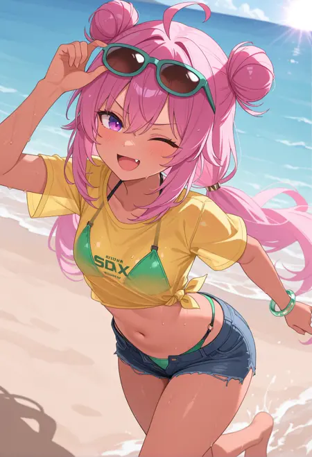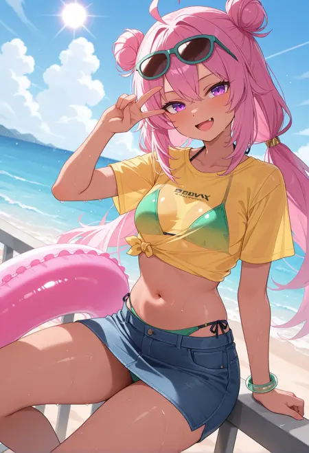 eyewear on head,sunglasses,swimsuit,yellow shirt,tied shirt,short sleeves,bikini,denim skirt,mini skirt,bikini under clothes,navel,single bracelet,SDVX,