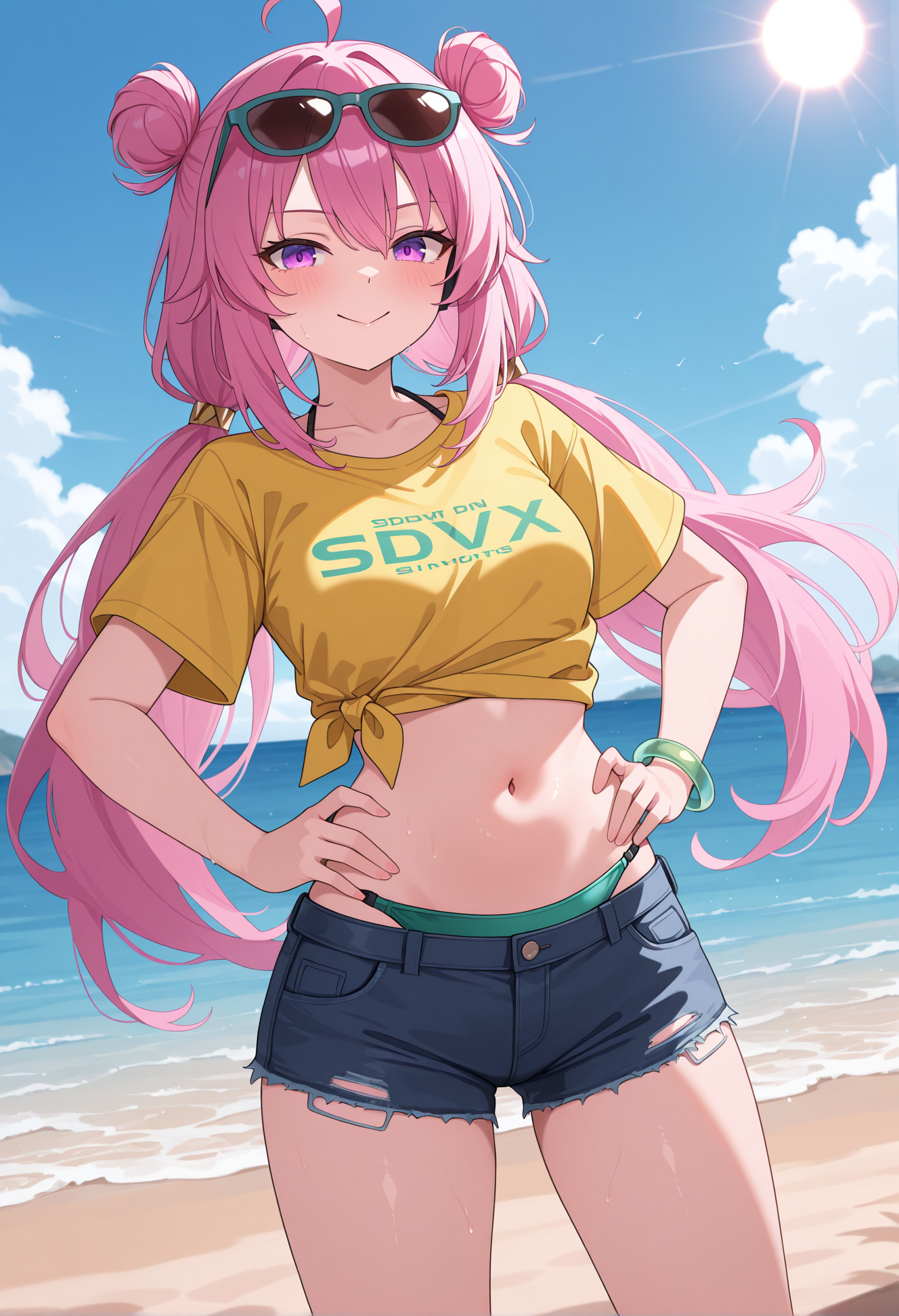 eyewear on head,sunglasses,swimsuit,yellow shirt,tied shirt,short sleeves,bikini,navel,single bracelet,SDVX,