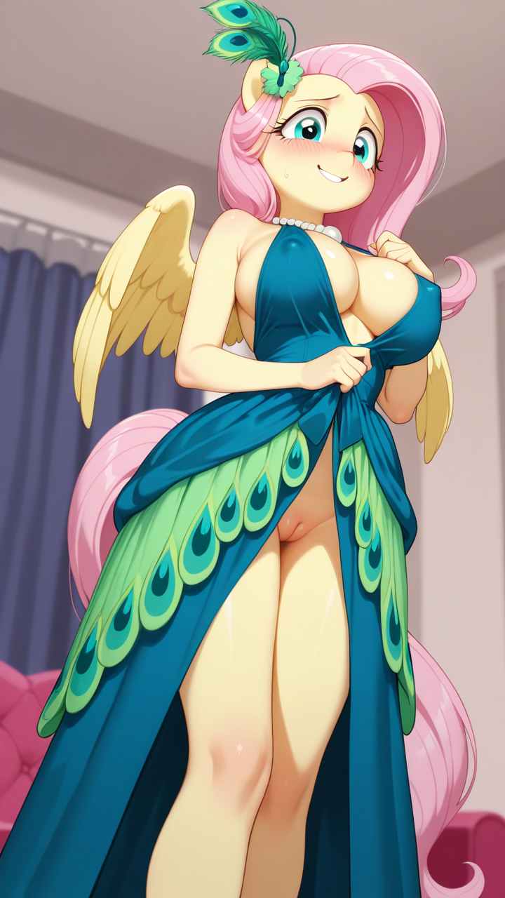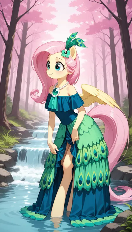 fluttershy pony, wings ,Yellow body, blue eyes, mane and tail of a soft pink color. Hair combed to one side, with curls at the ends,