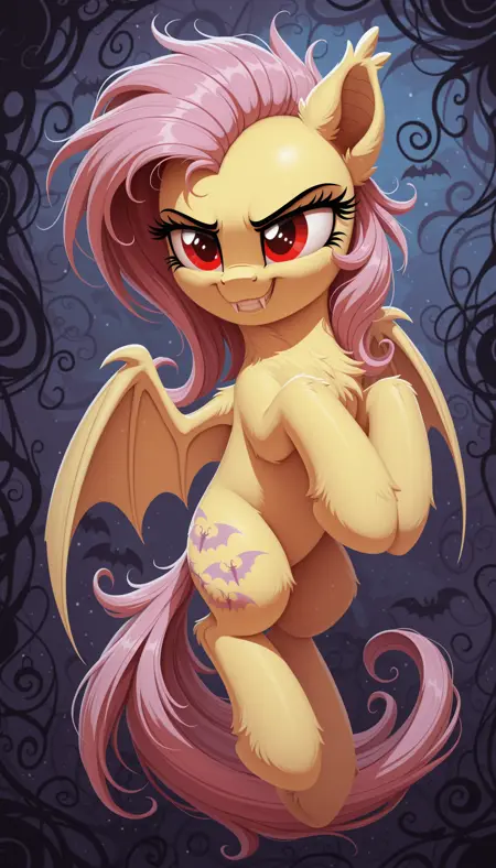 Flutterbat pony, yellow body with pink mane, red eyes, bat wings, wildly tousled mane, cutie mark - three pink bats, fangs like a vampire.