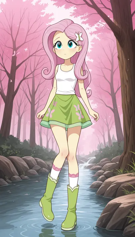 Clothes:white tank top, green short skirt with pink butterflies sewn onto small pink lace, green boots with white socks, with decorative elements.