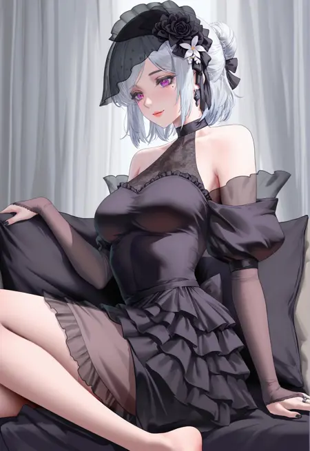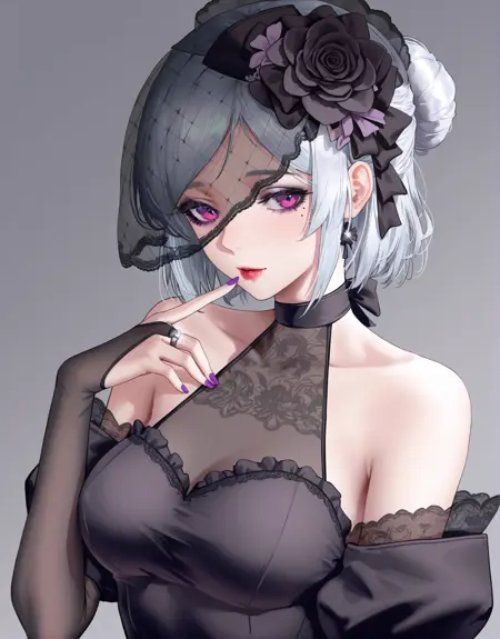태그: perfumerfa, 은색 머리, 짧은 머리, 단일 머리 뭉치, 스윕 앞머리, 머리에 꽃, 머리 장식, 검은 머리 장식, 검은 베일, 보라색 눈, 눈 밑 점, 메이크업, 검은 드레스, 어깨 드레스, 풍성한 소매, 분리된 소매, 투명, 검은 브라이드 장갑, 보석, 반지, 검은 신발, 하이힐