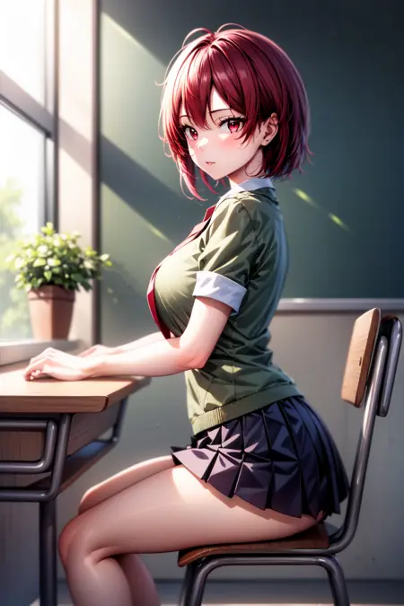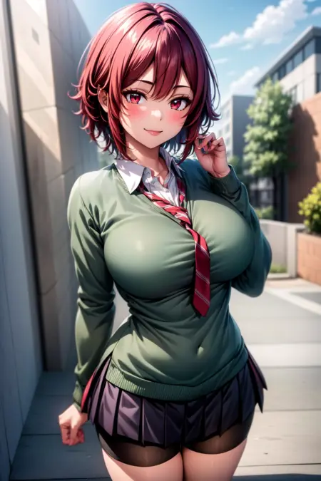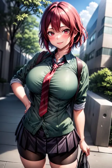 TomoAizawaNDV, 1girl, red hair, red eyes, large breasts, short hair, school uniform, bike shorts, green jacket, shirt, pleated skirt, red necktie