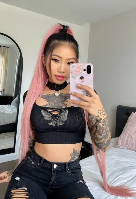 Trained on ~50 carefully curated images, this LoRA captures the tattooed kawaii Egirl aesthetic with: