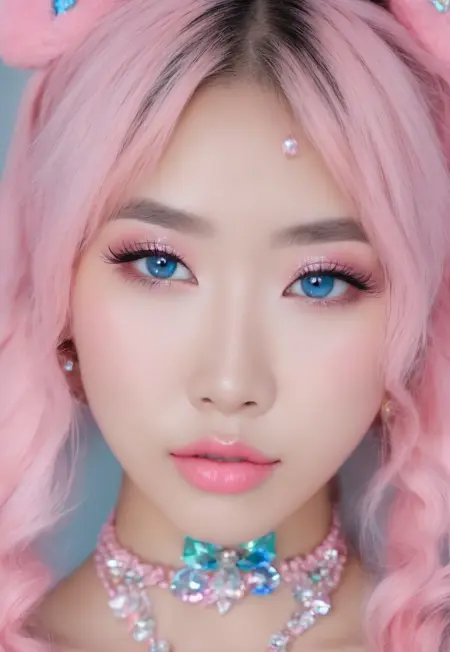 asian egirl uwu, masterpiece, ultra-detailed, close-up portrait of a kawaii tattooed asian egirl influencer, pastel pink ponytail, sleeve tattoos visible, glossy lips, bright luminous almond eyes with catchlight, cute uwu makeup, playful expression, cinematic soft light, Sony A7R IV, HDR sharp detail