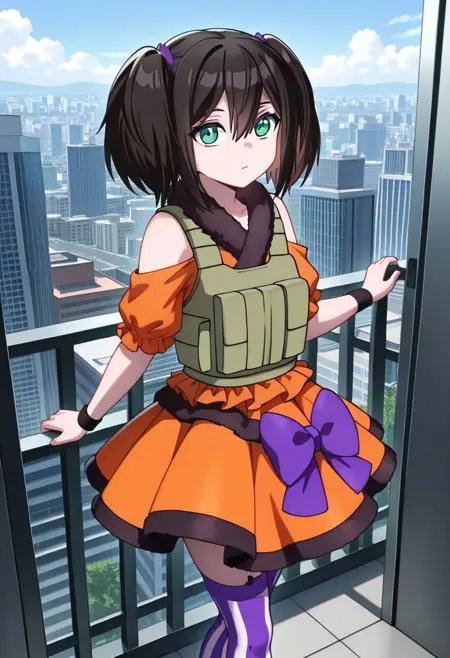 어깨 노출 드레스, 총알 방탄조끼, 팔찌, 허벅지 길이 스타킹, 하이힐 신발