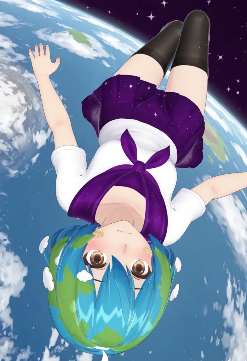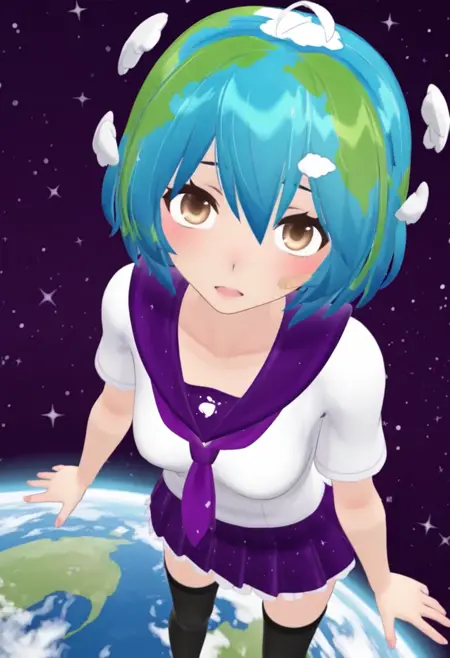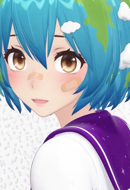E4r7hc4a9m, green and blue hair, bandaid on face, brown eyes, shirt, purple sailor collar, skirt, 3d