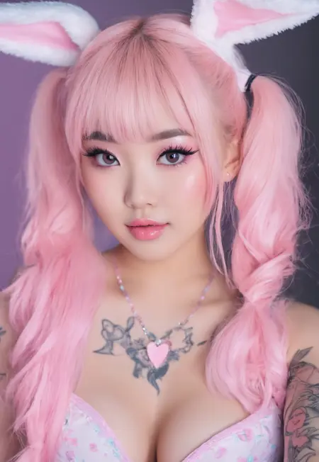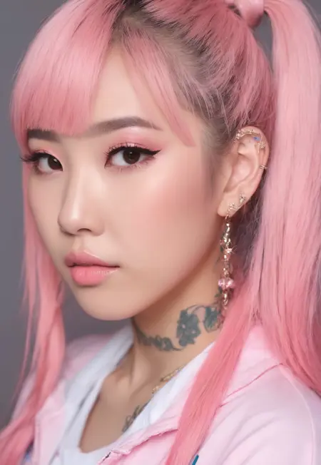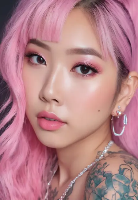 asian egirl uwu, masterpiece, ultra-detailed, close-up portrait of a kawaii tattooed asian egirl influencer, pastel pink ponytail, sleeve tattoos visible, glossy lips, bright luminous almond eyes with catchlight, cute uwu makeup, playful expression, cinematic soft light, Sony A7R IV, HDR sharp detail