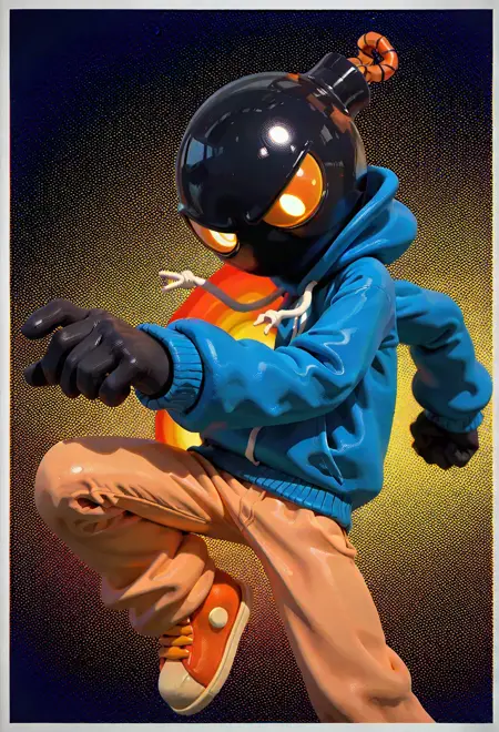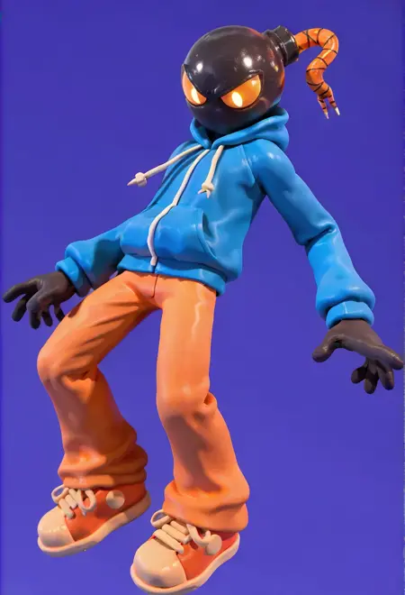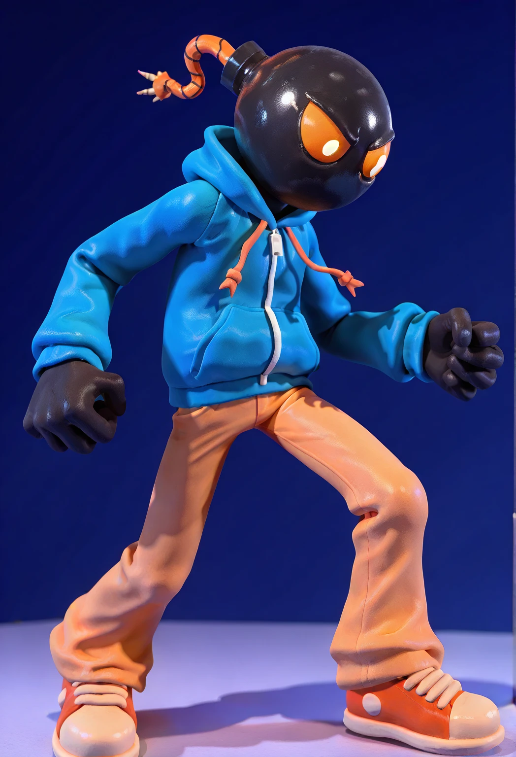 WhittyFNFC, 1boy, black body, black bomb-head, white eyes, glowing orange sclera, blue zip-up hoodie, beige pants, orange sneakers, spherical head with a lit fuse, 3d render