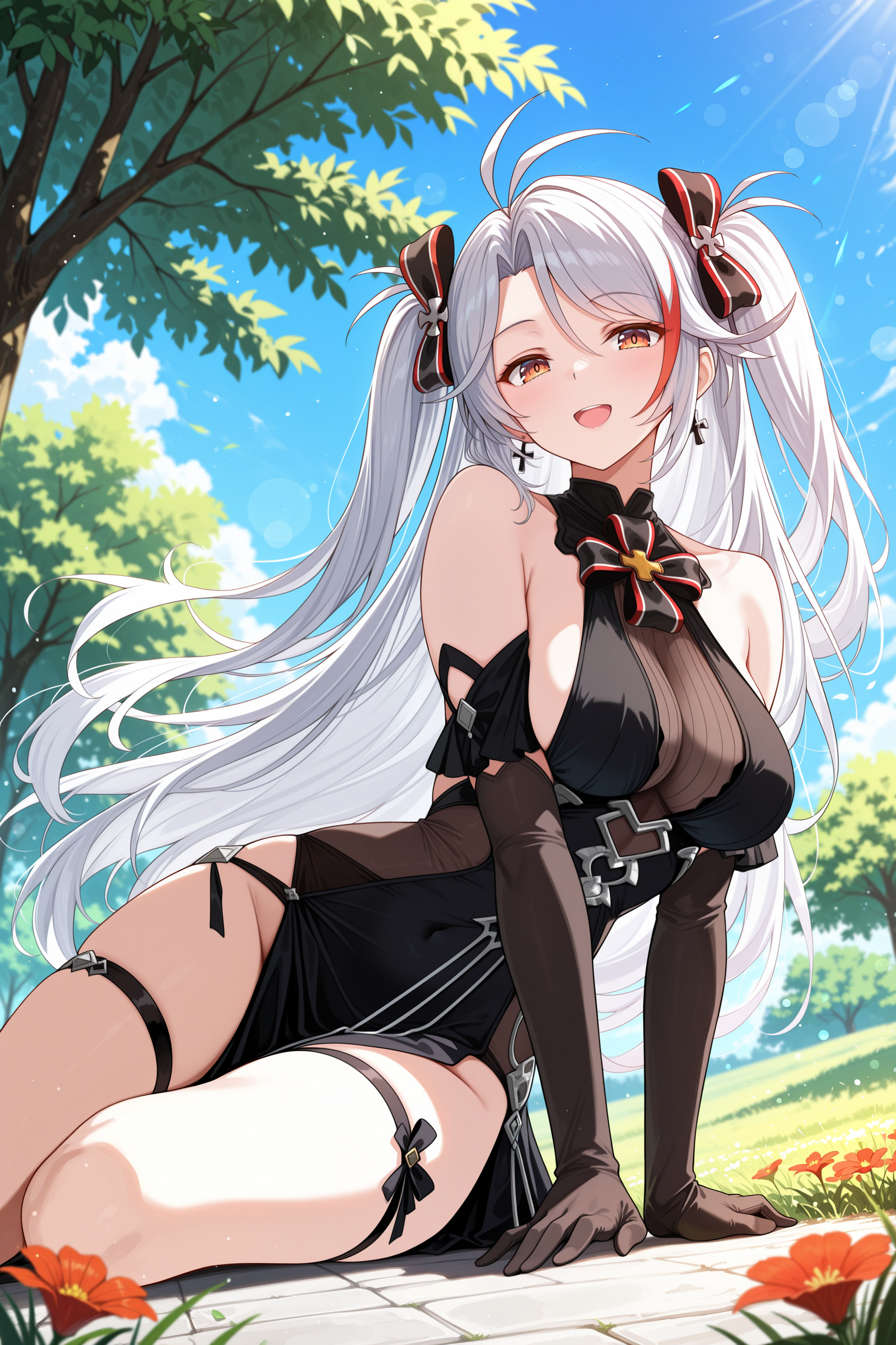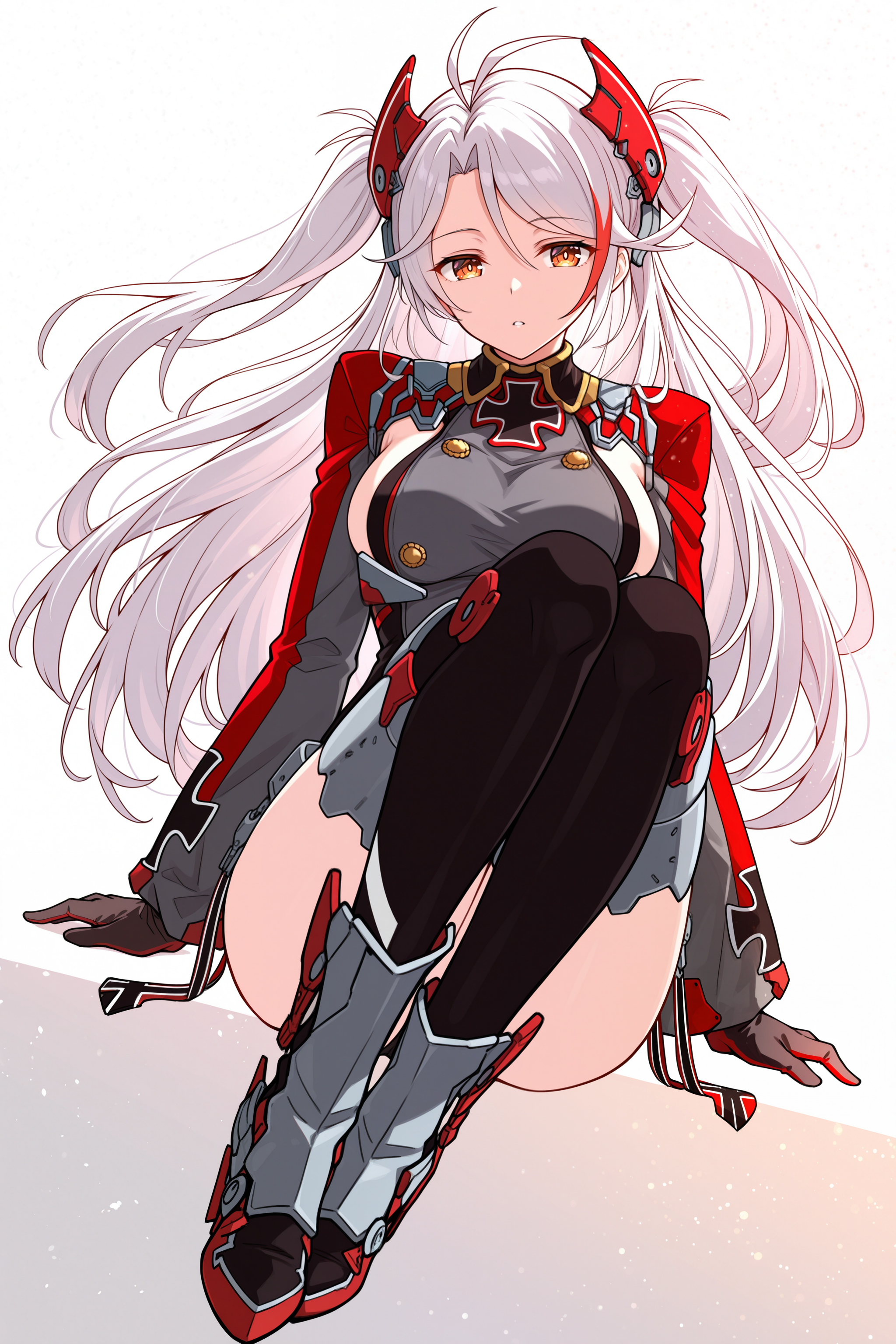 デフォルト衣装: prinz eugen \(azur lane\), default, white hair, orange eyes, uniform, long sleeves, two side up, red gloves, headgear, iron cross, clothing cutout, thigh boots,