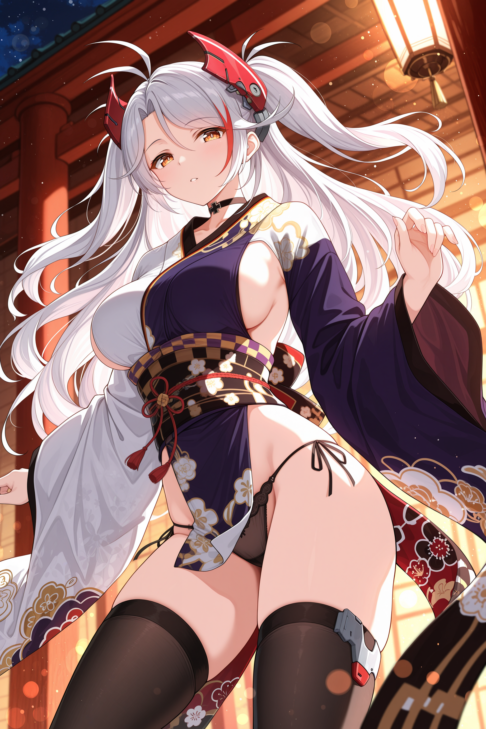豊かな花々: prinz eugen \(profusion of flowers\) \(azur lane\), profusion of flowers, white hair, orange eyes, japanese clothes, sideless kimono, wide sleeves, black thighhighs, two side up, side-tie panties, obi, black choker,