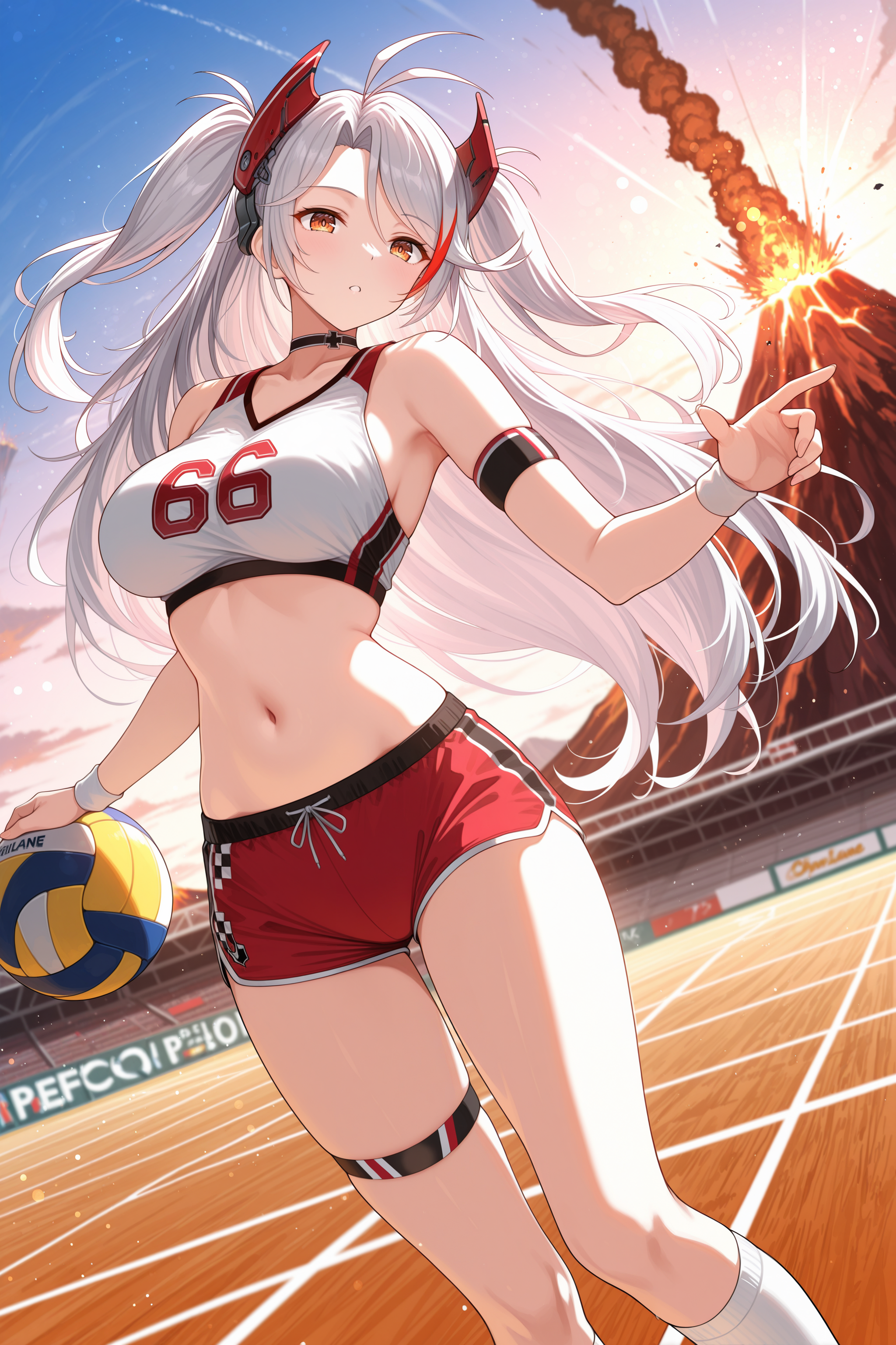 ブリリアント・タッチダウン: prinz eugen \(brilliant touchdown\) \(azur lane\), brilliant touchdown, white hair, orange eyes, red shorts, two side up, crop top, white tank top, white socks, black headgear, black choker, sportswear, armband, dolphin shorts,