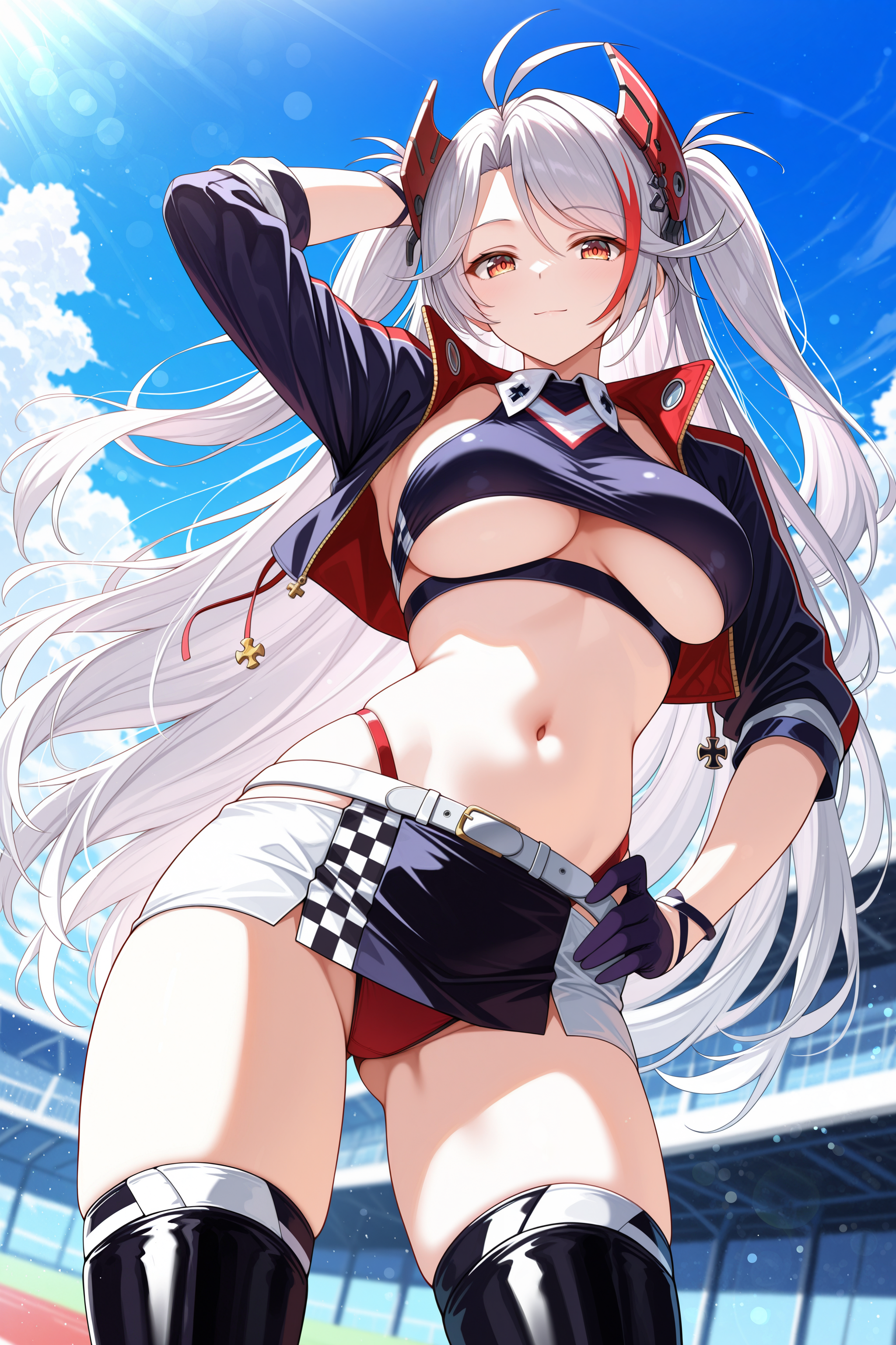 ファイナルラップ: prinz eugen \(final lap\) \(azur lane\), final lap, white hair, orange eyes, race queen, thighhighs, white belt, panty straps, skirt, headgear, black jacket, cropped jacket, open jacket, cropped shirt, thigh boots, underboob cutout, highleg panties, red panties,