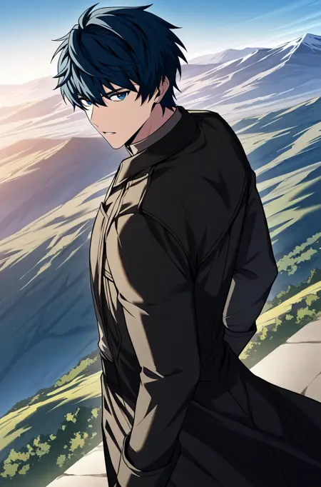 Joshua, 1boy, solo, blue eyes, dark blue hair, short hair, messy hair, uneven bangs, hair between eyes,