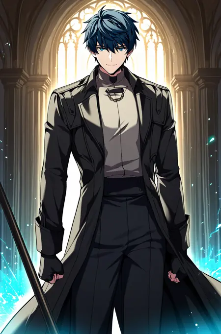 Joshua_outfit, black long coat, grey shirt, chain accessory, fingerless gloves, black pants, black boots