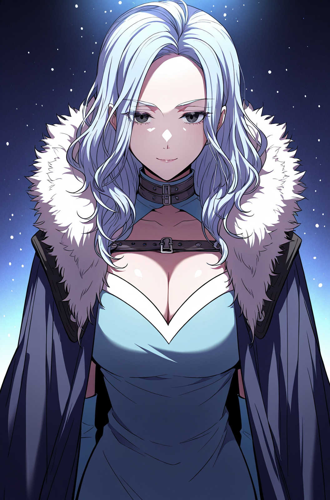 Elisha_outfit, dark blue fur cloak, blue dress, white trim, sleeveless dress, high collar, cleavage cutout, leather choker, leather straps, long gloves, blue long gloves,