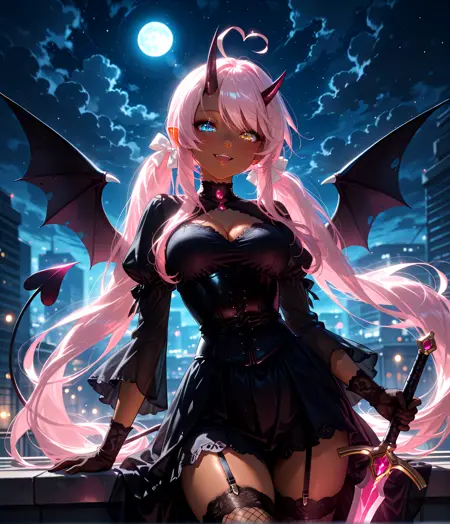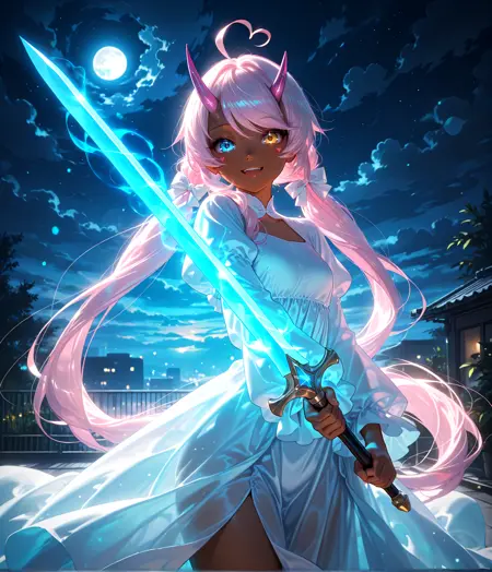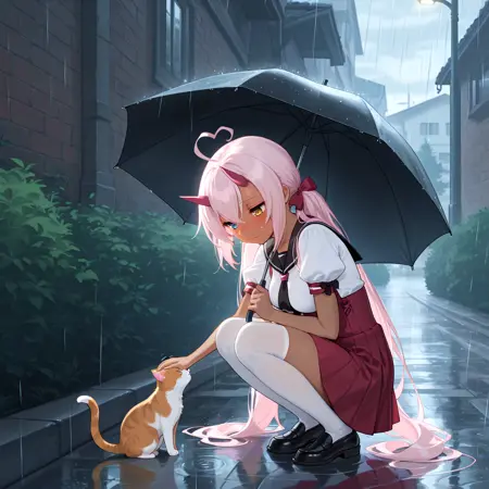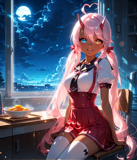 indischool, 파란 눈, 노란 눈, 매우 긴 머리, 연분홍색 머리, 하트 모양 아호게, 사이드 포니테일, 낮은 트윈테일, 빨간 머리 리본, 이색안색, 오니 뿔, 짙은 피부, 짙은 피부의 여자, 중간 크기의 가슴, 언더버스트, 검은 해군 칼라, 퍼프 슬리브, 검은 리본, 흰색 셔츠, 학교 유니폼, 주름 치마, 서스펜더 치마, 하이웨이스트 치마, 빨간 치마, 젯타이 리ョ우키, 흰색 허벅지 양말, 검은 로퍼,