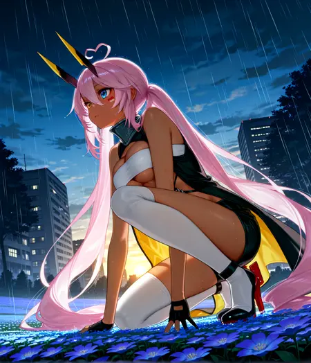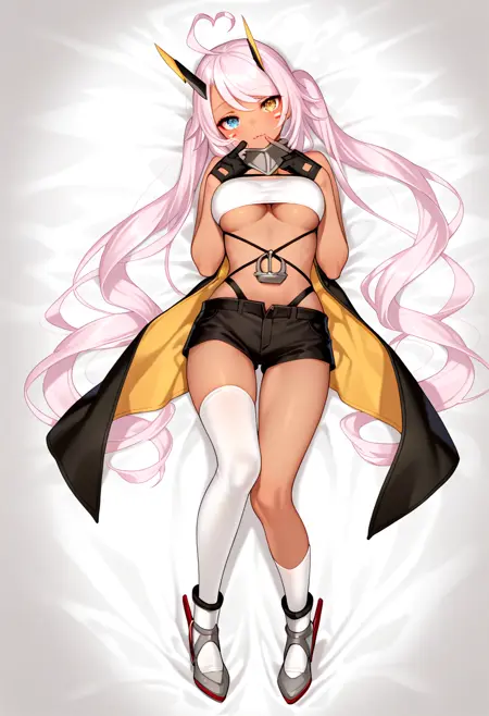 indidef, 매우 긴 머리, 연분홍색 머리, 하트 모양 아호게, 사이드 포니테일, 낮은 트윈테일, 이색안색, 파란 눈, 노란 눈, 기계식 뿔, 어두운 피부, 짙은 피부의 여자, 중간 크기의 가슴, 고르게, 언더부브, 짙은 피부의 여자, 얼굴 페인트, 흰색 밴도, 소매 없는 재킷, 이-tonal 재킷, 열린 재킷, 크롭된 재킷, 부분적으로 손가락이 없는 장갑, 닻, 검은 색 반바지, 짧은 반바지, 벨트, 한쪽 허벅지 긴 양말, 한쪽 무릎 긴 양말, 흰색 허벅지 양말, 흰색 무릎 양말, 비대칭 다리 착장, 하이힐, 키르크 신발,